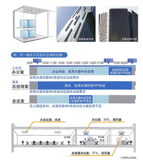 與傳統(tǒng)水系統(tǒng)中央空調(diào)配合,辦公時(shí)段采用大樓中央空調(diào),加班時(shí)段則可靈活采用水源熱泵VRV系統(tǒng)對(duì)應(yīng)空調(diào)需求。根據(jù)實(shí)際需 要,追加水源熱泵VRV系統(tǒng)。