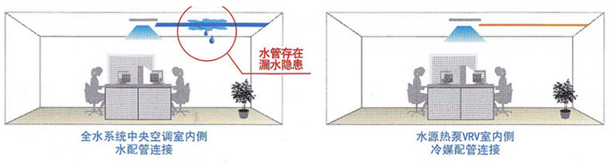 大金水源熱泵VRV主機(jī)與室內(nèi)機(jī)之間通過(guò)冷媒配管連接,水管集中布置于主機(jī)機(jī)房及管井內(nèi),大大降低了系統(tǒng)漏水對(duì)于室內(nèi)重 要設(shè)備破壞的隱患。