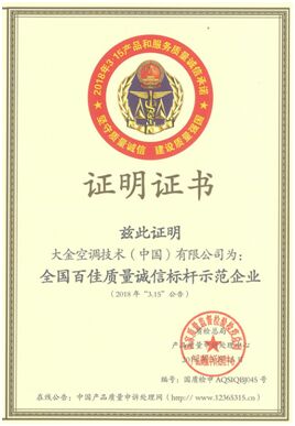 近日,國家質量監督檢驗檢疫總局產品質量申訴處理中心向大金空調頒發了“全國百佳質量誠信標桿示范企業”證書,旨為彰顯質量誠信標桿企業的引領作用,增強全社會的質量誠信意識,引導全社會積極響應“中國制造2025”戰略。在全國各行業內審核確認“全國百佳質量誠信標桿示范企業”,大金空調為今年全國范圍內的百家獲獎企業之一。